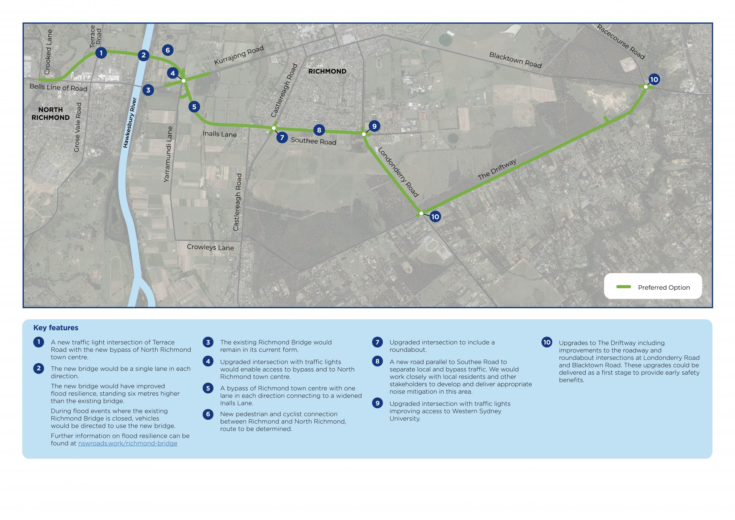 The government’s preferred route [see images below] sees a second, higher bridge built north of the existing Richmond bridge. A new roadway will bypass Richmond to the south, connecting from Old Kurrajong Road to the Driftway.