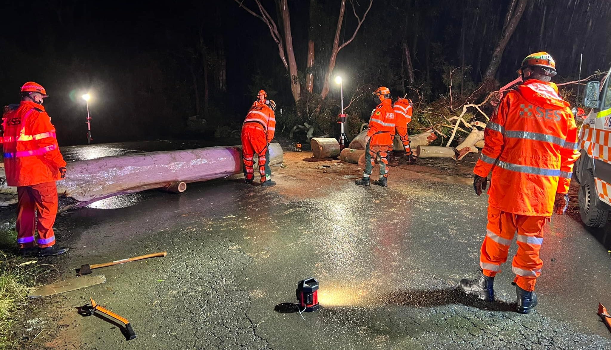 Hills SES volunteers responding to a fallen tree at Fred Caterson Reserve, which blocked access to over 100 people unable to drive out of the Castle Hill complex (3 July).