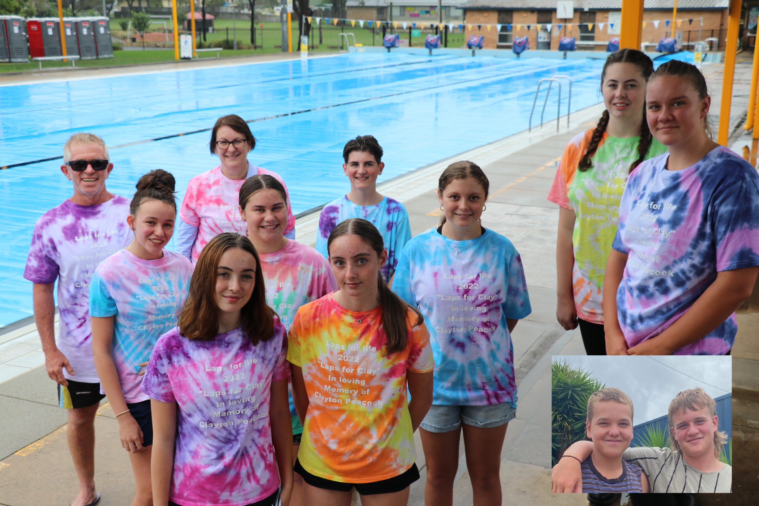 Picture: From back, left to right, Clayton’s dad Simon and Susan Templeman with the Laps for Clay team of Luke, Charlotte, Gemma, Cassidy, Vanessa, Charlotte, Isabelle and Sophie-Rose at Hawkesbury Oasis. Inset: team members Logan and Danny.
