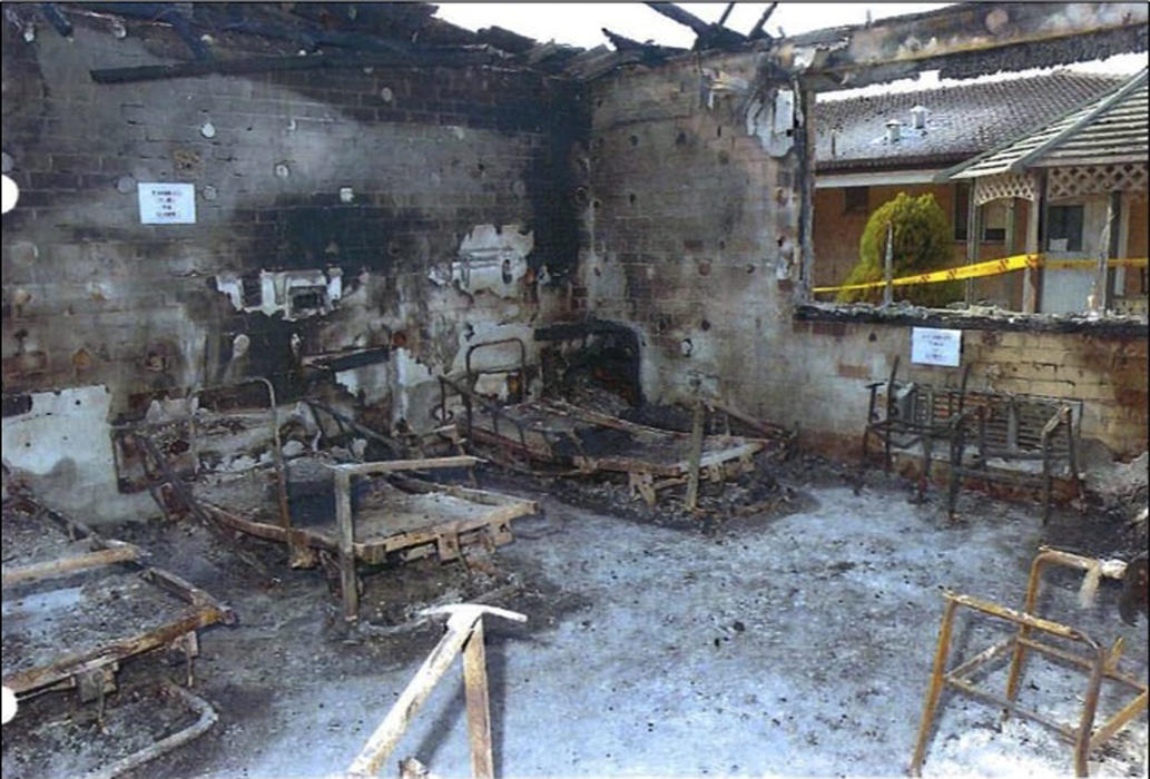 Two fires were deliberately lit in separate wings. The first fire was minor and contained in an unoccupied room. The second fire was lit in an occupied room and spread throughout the wing.