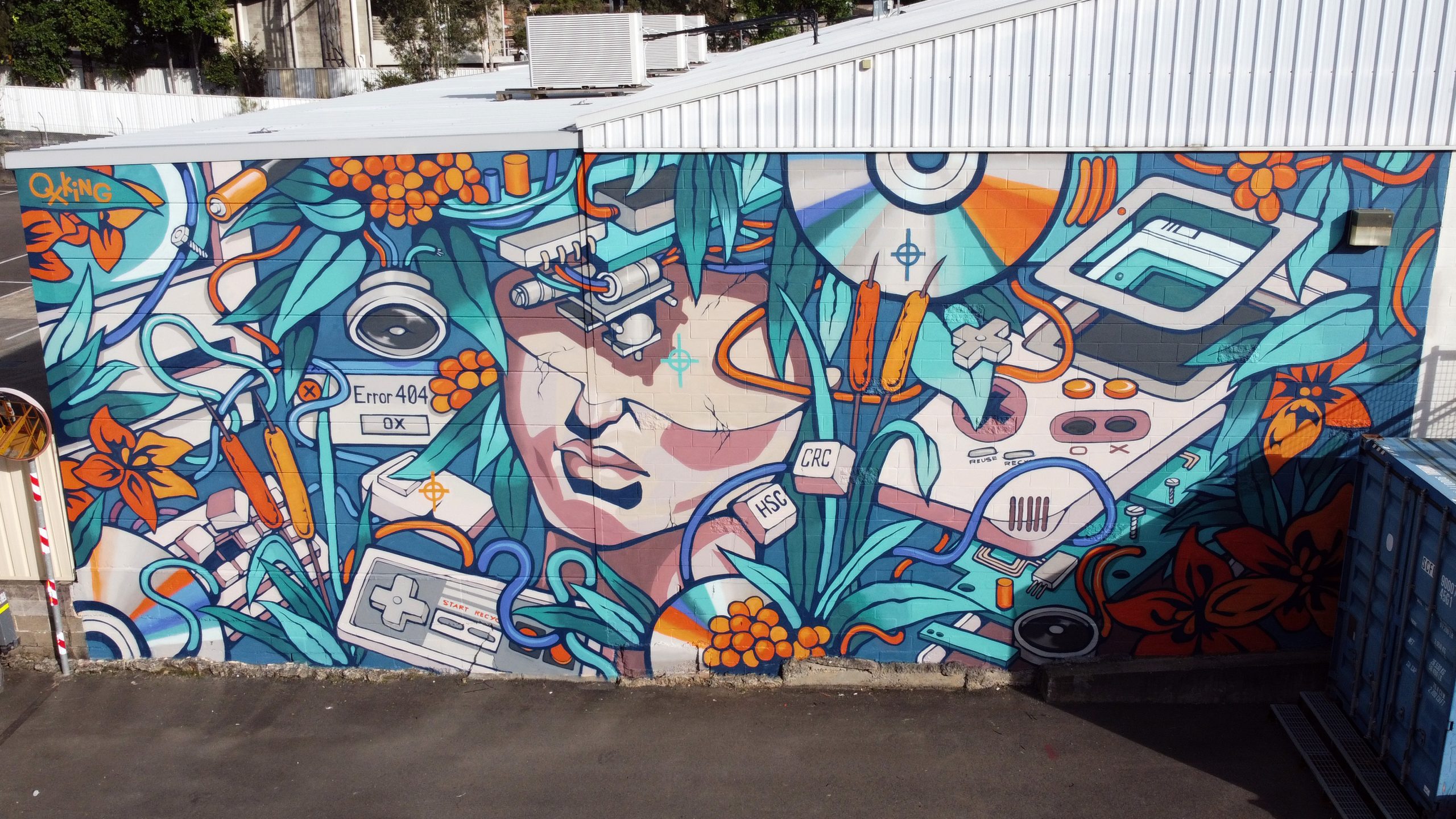 RE://CYCLE by Sydney artist Ox King (Steven Nuttall) highlights the goldmine of resources available in e-waste waste (computers, televisions and associated items). The mural depicts the relationship between technology, society and nature and acts as a call to arms for our residents to recycle old electronic waste at the CRC.