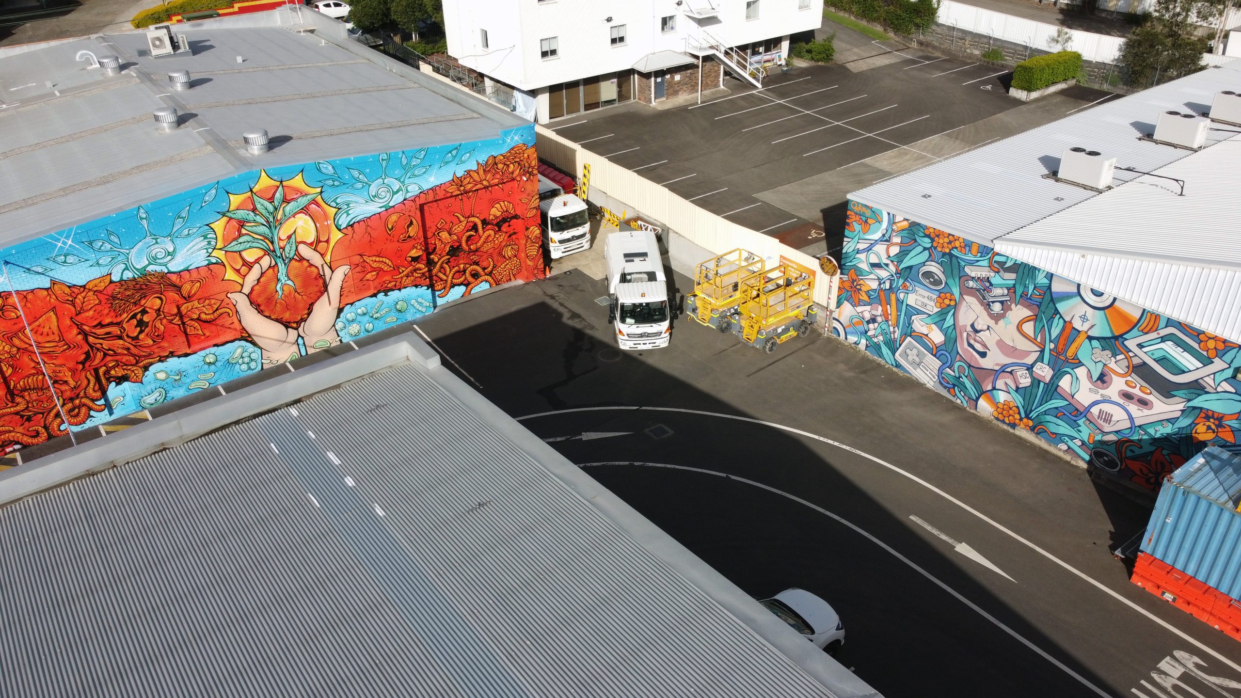 The walls of Hornsby Shire Council’s Community Recycling Centre (CRC) at Thornleigh are shining a light on the importance of recycling e-waste and organics, thanks to two new murals by two of Australia’s best-known mural artists, Tim Phibs and Steven Nuttall – aka Ox King.