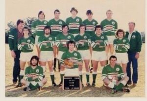 Glen Baigent took time out from doing that voodoo, that cobblers and locksmiths do so well, to proudly hold aloft the Best Forward trophy he earned during that auspicious season he had with the Badgery’s Creek A Grade league team back in 1982.